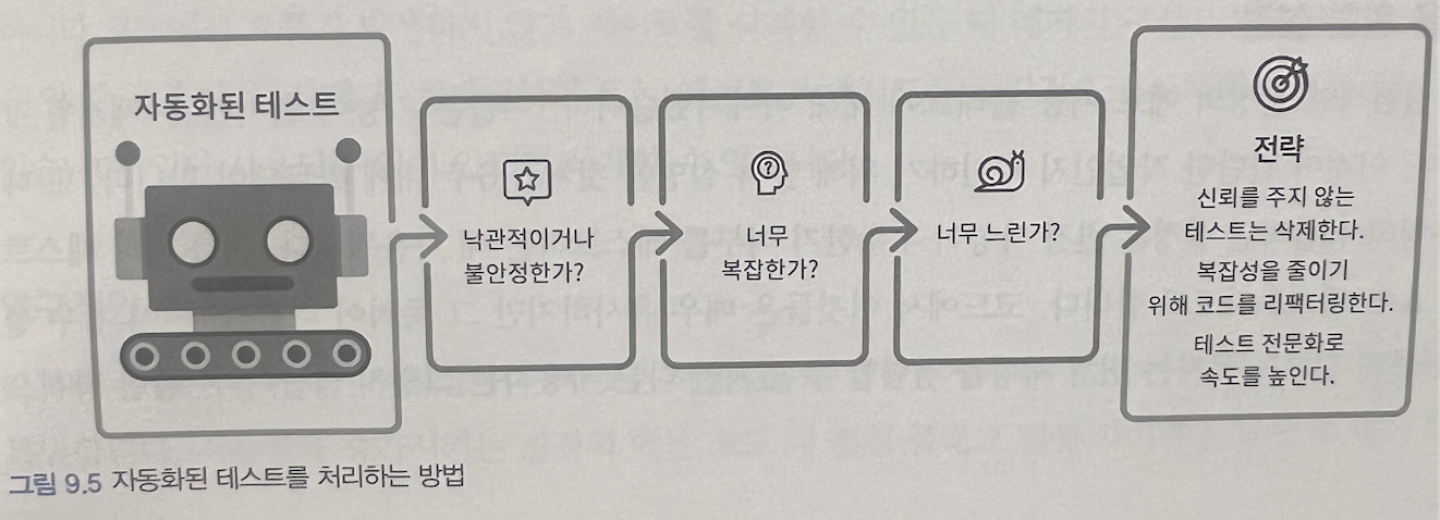 - 이경우 느린 테스트와 빠른 테스트를 분리하고 가능한 자주 빠른테스트를 실행하거나 느린 테스트의 실패원인을 관찰하여 필요 없다면 제거한다.