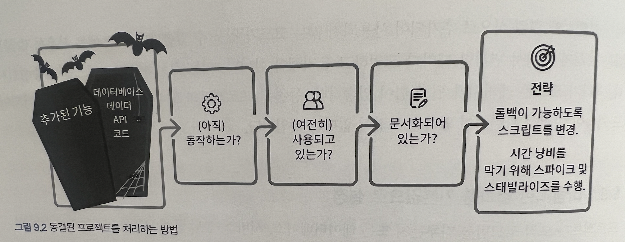 동결된 프로젝트는 코드에 국한되어 있지 않다. DB테이블, 통합, 서비스등이 포함되며 원래 작성자가 프로젝트에 대해 잊은 경우 존재조차 알아차리기 힘들 수 있다.